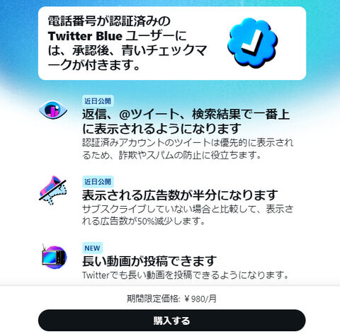 | ツイッターブルー、日本でも開始 980円で「認証済みバッジ」 米ツイッターが、有料サービス「ツイッターブルー」の提供を、日本でも始めたことが11日分かった。契約すると、アカウントに青いチェックマークの「認証済… (出典:朝日新聞デジタル) |