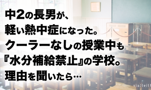 | 「いつの時代の教育だよ」遠足でお茶購入認めず児童が熱中症、学校は「症状出たら容認」時代錯誤の言い分 (出典:週刊女性PRIME) |