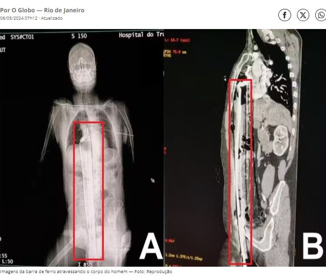 ブラジルの建設現場で働いていた男性は、高さ5メートルの足場から転落し、鉄の棒が肛門付近から胸部まで縦に突き刺さりながらも生き抜いた。