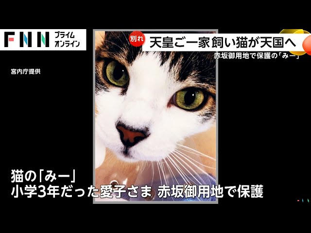 宮内庁は9日、天皇、皇后両陛下と長女愛子さまが飼われていた猫「みー」が、皇居・御所で3日に病気で死んだと明らかにした。ご一家でみーの安らかな旅立ちを見送ったという。