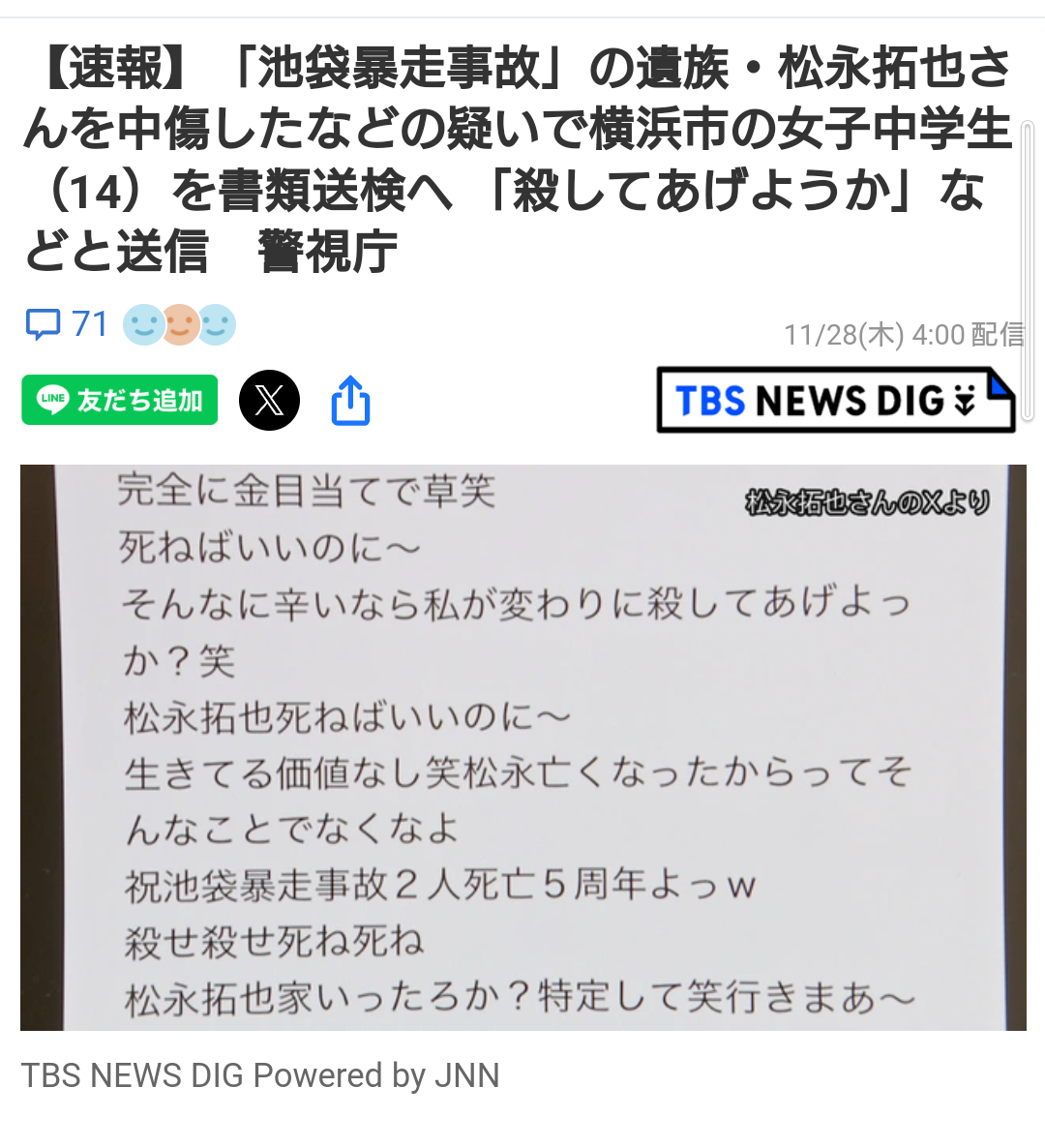 | 中学3年生「私的な悩みがあった」 池袋暴走事故の遺族を脅迫疑いで書類送検 …「池袋暴走事故」の遺族・松永拓也さんをメールで脅迫した疑いで書類送検されたのは、14歳の中学生でした。 「殺してあげよっか?」 書類送検されたのは中… (出典:) |