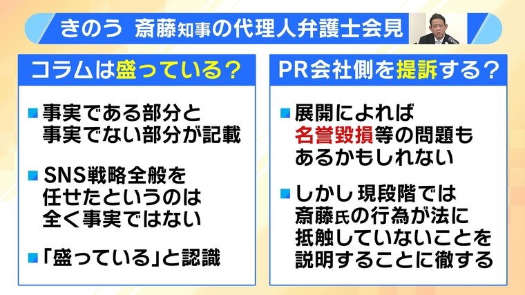 27日に斎藤知事の代理人弁護士が会見し、公選法問題に関して、斎藤氏側がPR会社に依頼したのはポスター制作などで約71万円。