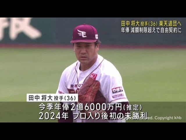 日本野球機構(NPB)は2日、自由契約選手を公示。野球協約の制限(年俸1億円以上は40%)を超える減額を提示されたため、すでに退団を表明していた楽天・田中将大投手(36)も名を連ね、他球団との交渉が解禁された。本人は引き続きNPBでのプレーを希望しているが、オファーに消極的な姿勢を見せる球団が相次ぐなか、ヤクルトが獲得に乗り出さない方針を固めたことが分かった。 (塚沢健太郎)