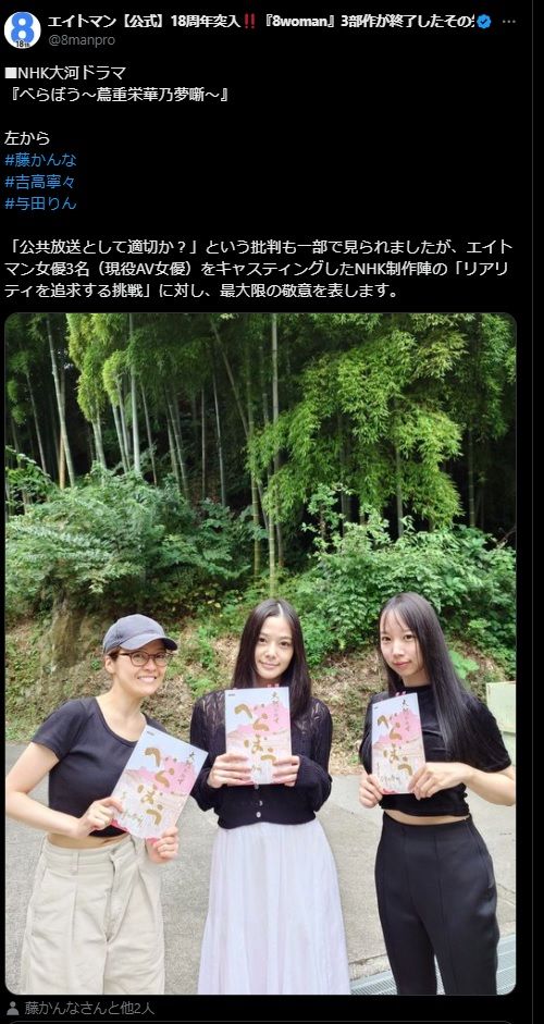 AVモデルプロダクション「エイトマン」に所属する吉高寧々さん、藤かんなさん、与田りんさんの3人の人気セクシー女優だったことだ。