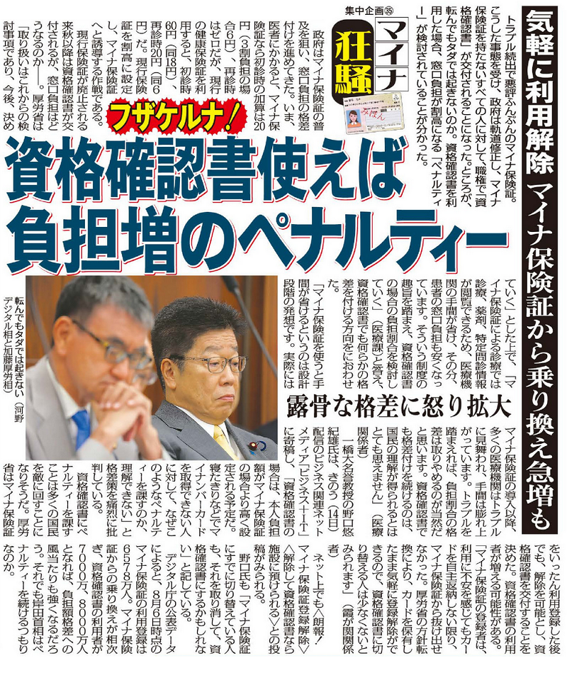| 「資格確認書」利用で窓口負担増の“ペナルティー”を政府検討 露骨な格差に識者も怒り露わに (出典:日刊ゲンダイDIGITAL) |